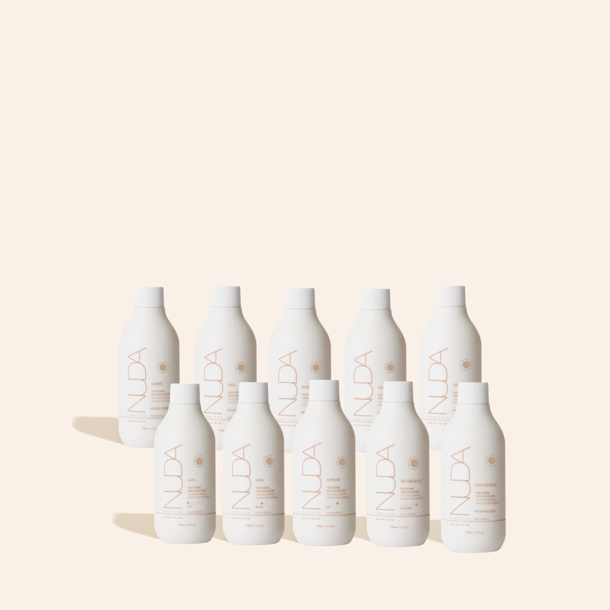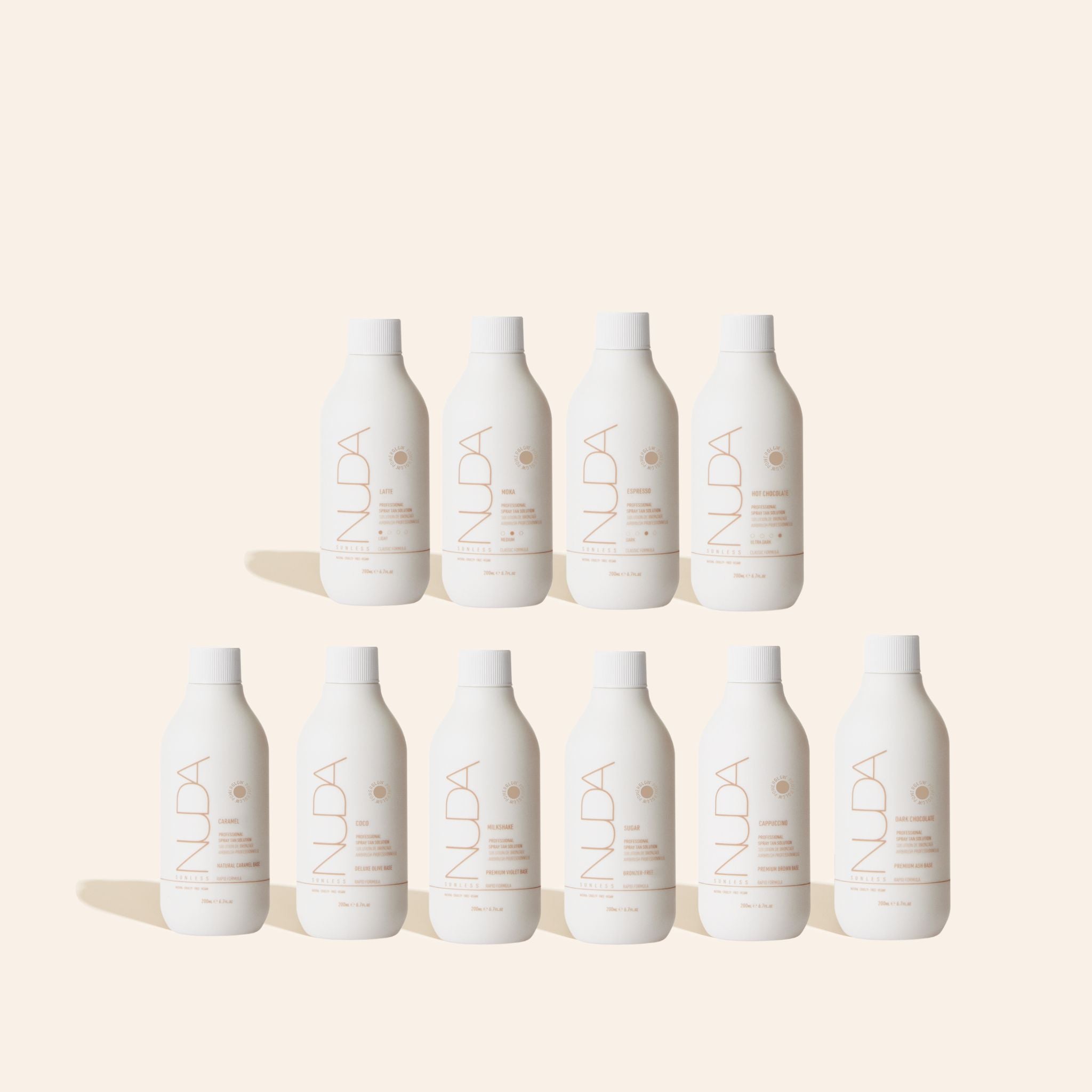 All 10 Nuda Spray Tan Solution Samples in a bundle set. Features sample-size products of all our Regular Solutions and all of our Rapid solutions.