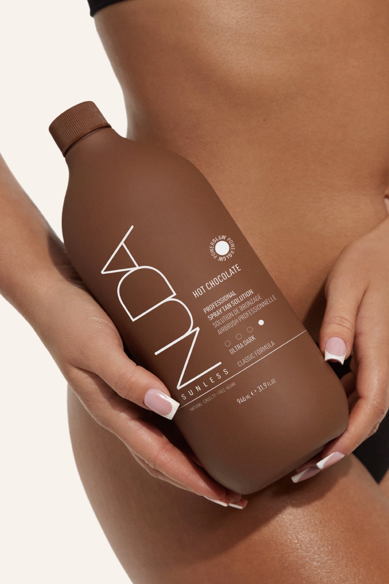 Hot Chocolate is our best spray tanning solution with an ultra dark brown bronzer. For clients with dark complexions who tan easily.