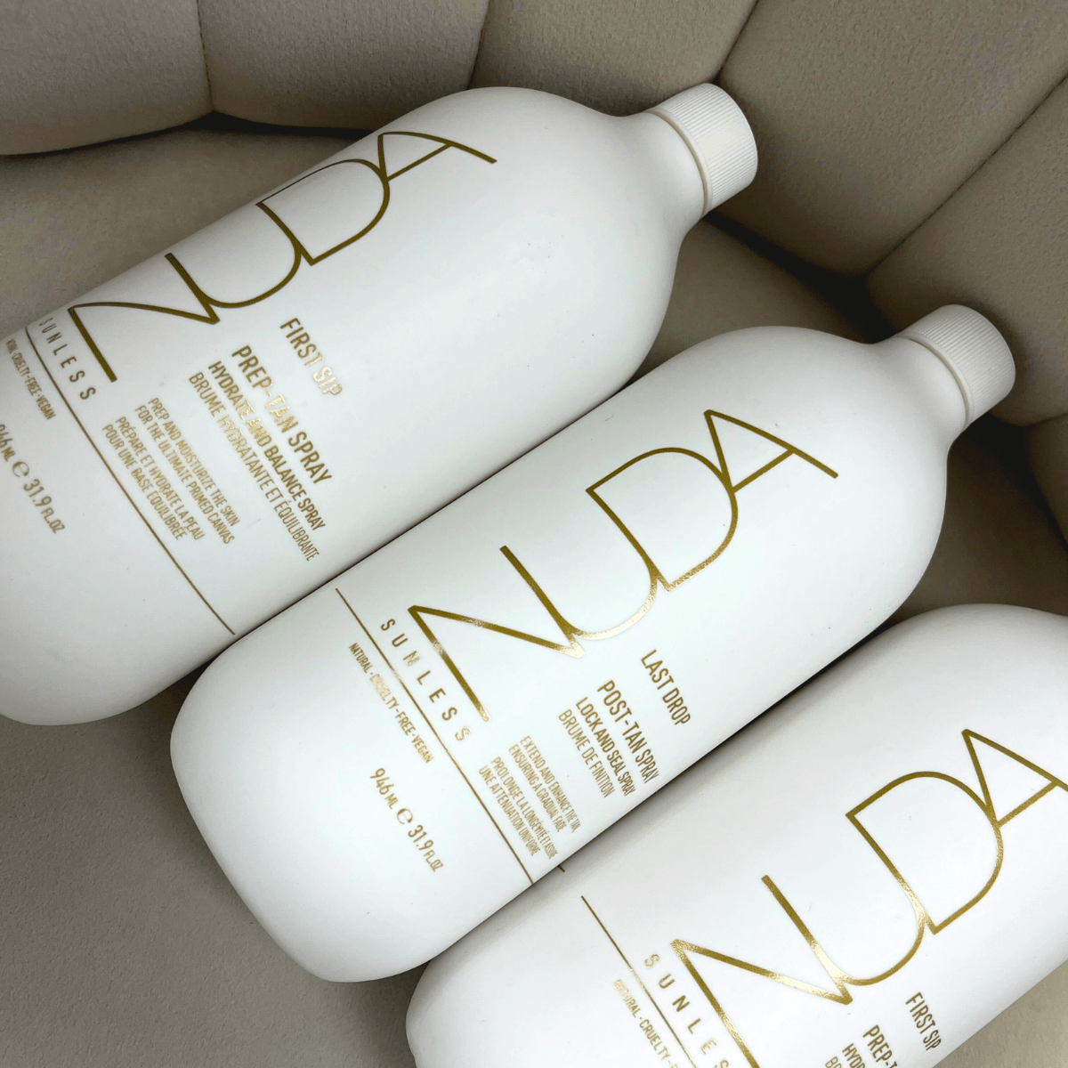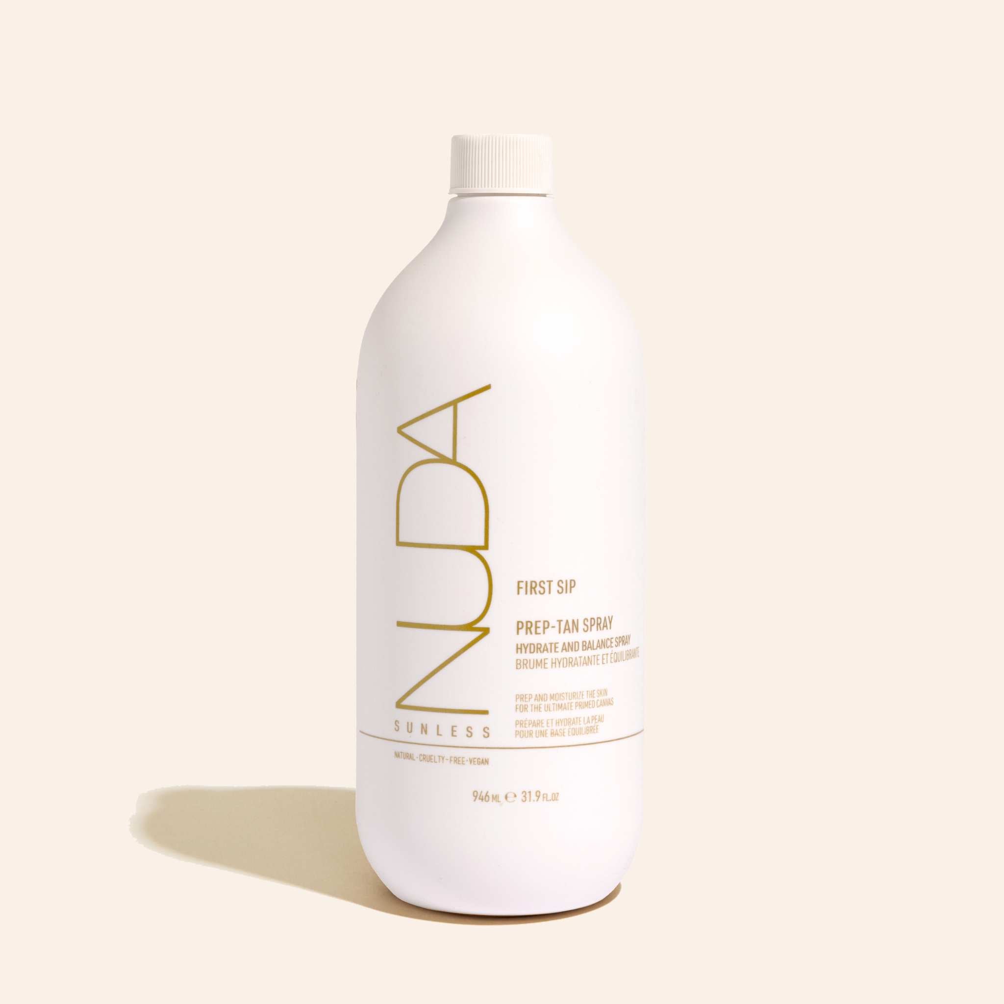 The perfect foundation for your spray tan. First Sip is a refreshing prep spray that primes and perfects skin for a flawless application and longer-lasting glow. This advanced formula balances, hydrates, and cleanses, creating the ideal canvas for an even, streak-free tan.