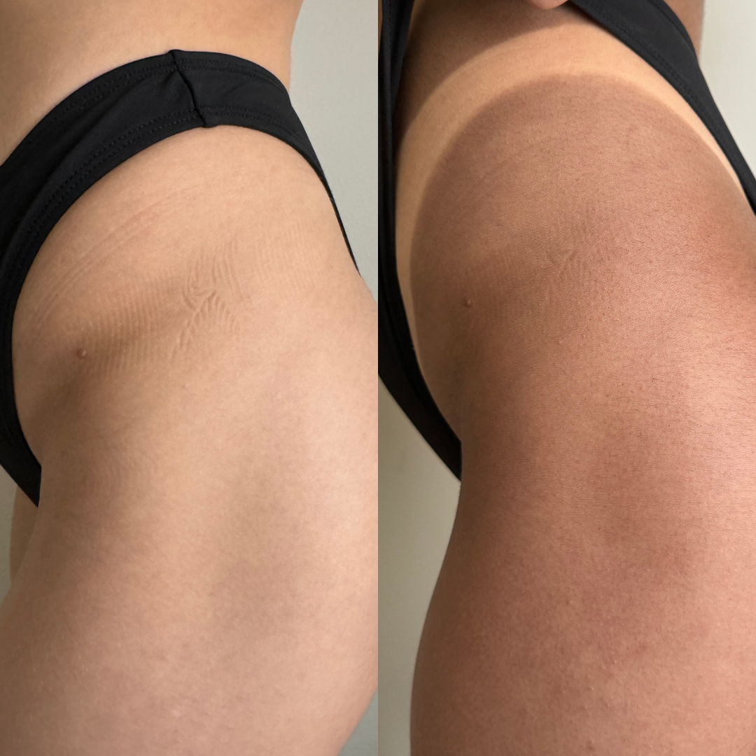 Comme la plupart des mariées portent une robe blanche et sont très occupées pendant la journée et la semaine précédant leur mariage, nous voulions absolument créer une solution rapide (développement entre 1 et 5 heures) pour les mariées. En ayant un temps de développement court, cette solution est idéale pour les mariées occupées qui ne veulent pas attendre 8 à 12 heures pour découvrir le résultat final de leur spray tan. De plus, cette solution n’a pas de couleur guide, communément appelée bronzer, ce qui est idéal pour les vêtements clairs comme une robe de mariée blanche. Effectivement, avec la solution Sugar, les mariées n’ont pas à s’inquiéter de voir la couleur de leur bronzage airbrush se transférer sur leur robe de mariée avec Nuda! Notre solution est transparente comme de l’eau et ne transfère pas sur les vêtements, ce qui peut être très rassurant pour une mariée!