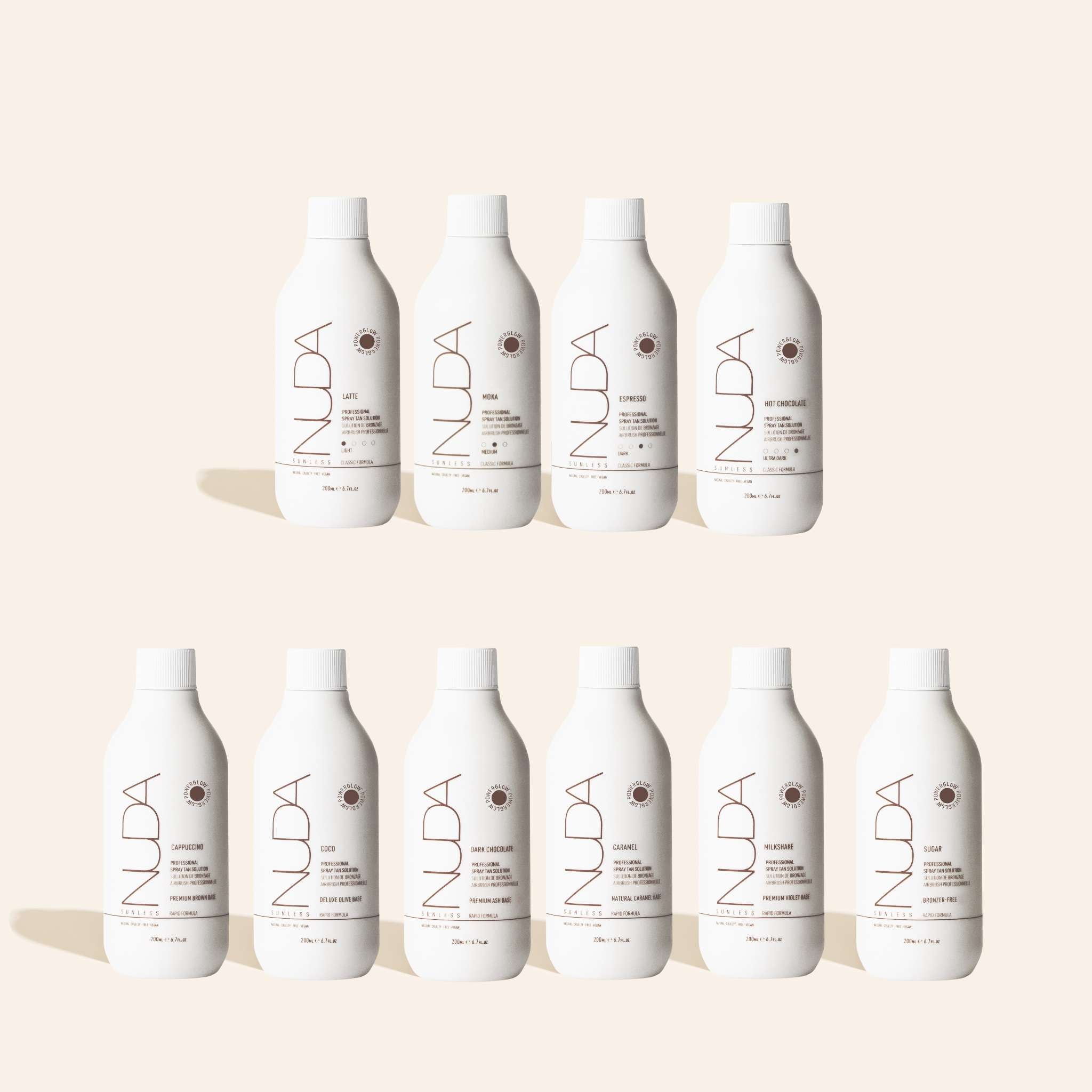 Ce coffret contient les 10 échantillons de solutions autobronzantes Nuda Spray Tan. Il inclut des formats échantillons de toutes nos solutions régulières et de toutes nos solutions rapides.