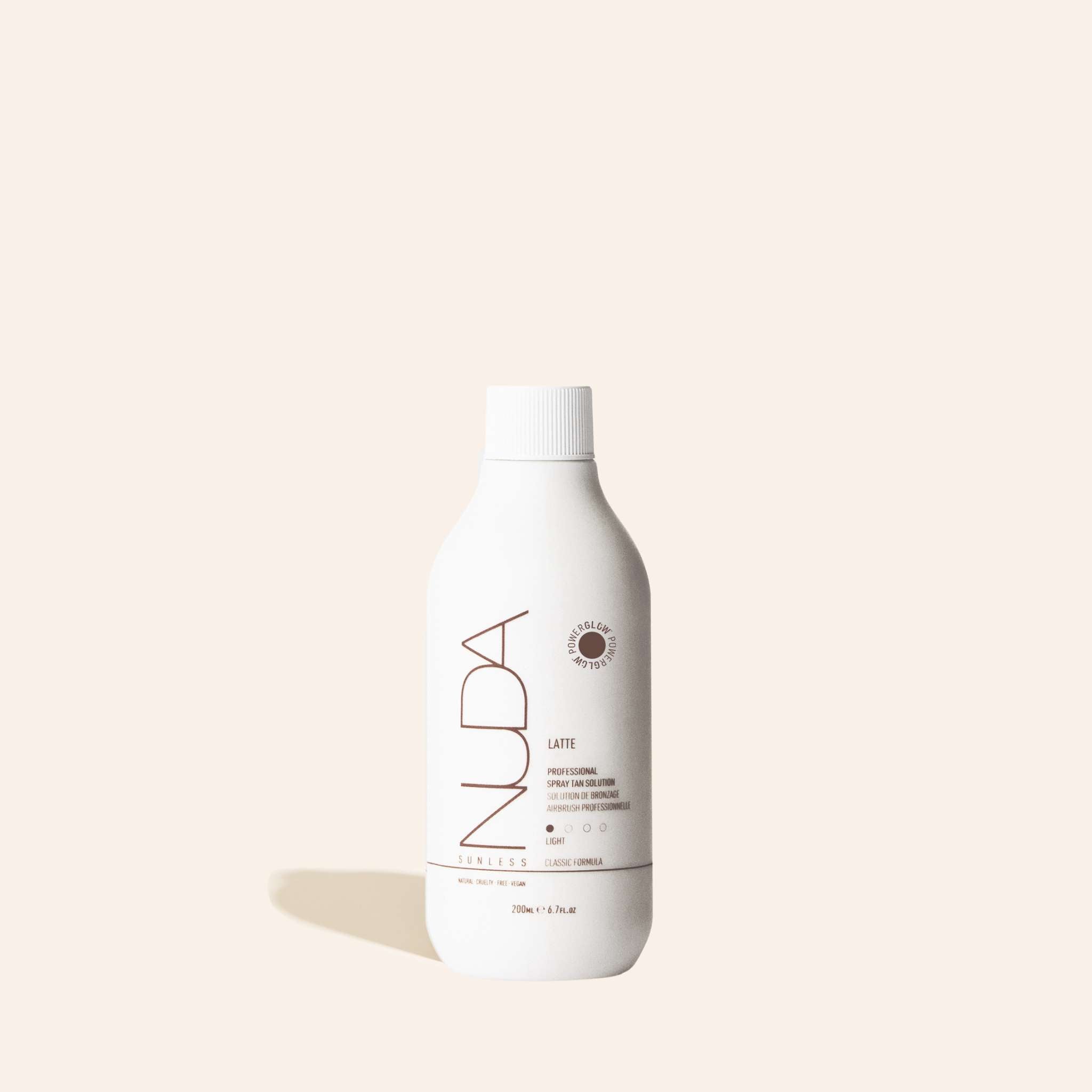 Latte est notre solution de bronzage spray tan avec une couleur guide brun clair. Pour les peaux pâles ou très pâles qui bronzent difficilement.