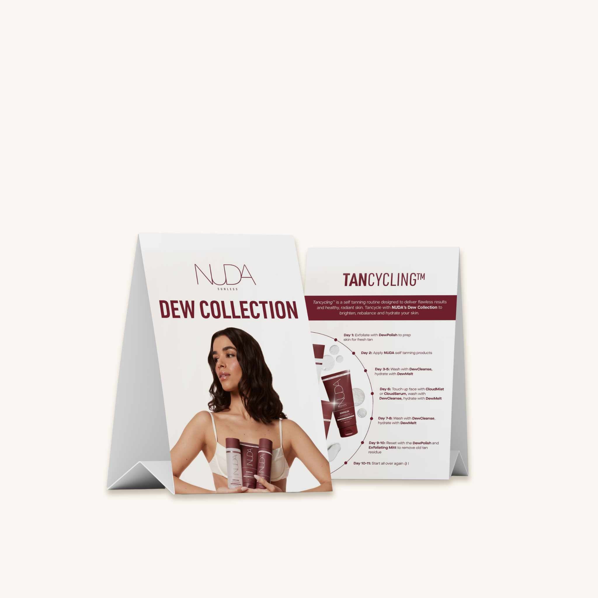 Un présentoir en carton plié en papier présentant la collection Dew de Nuda et l'utilisation de nos produits de soins pour le corps dans le cadre de votre routine TanCycling. Une excellente façon de mettre en avant les informations et les innovations produits sur votre présentoir.